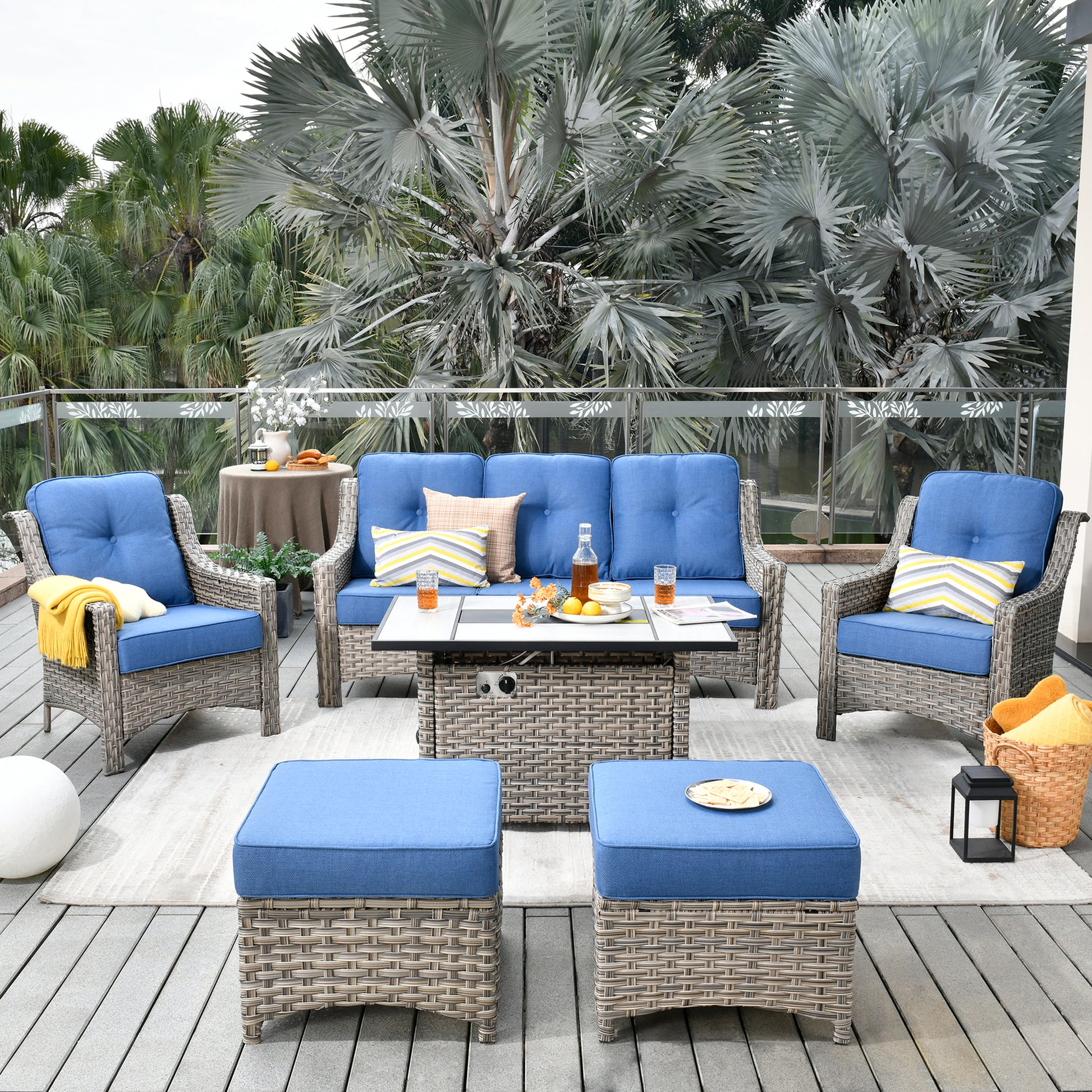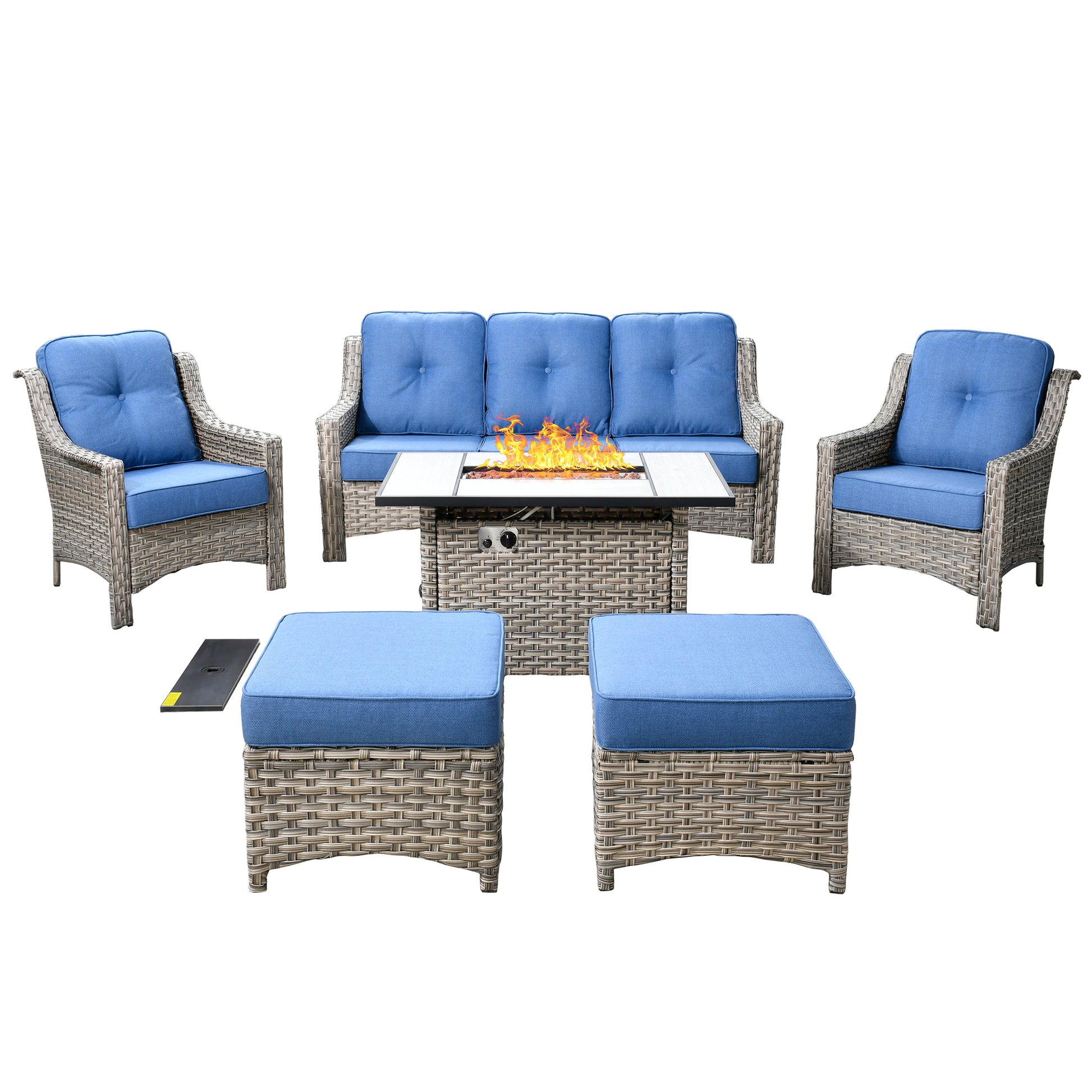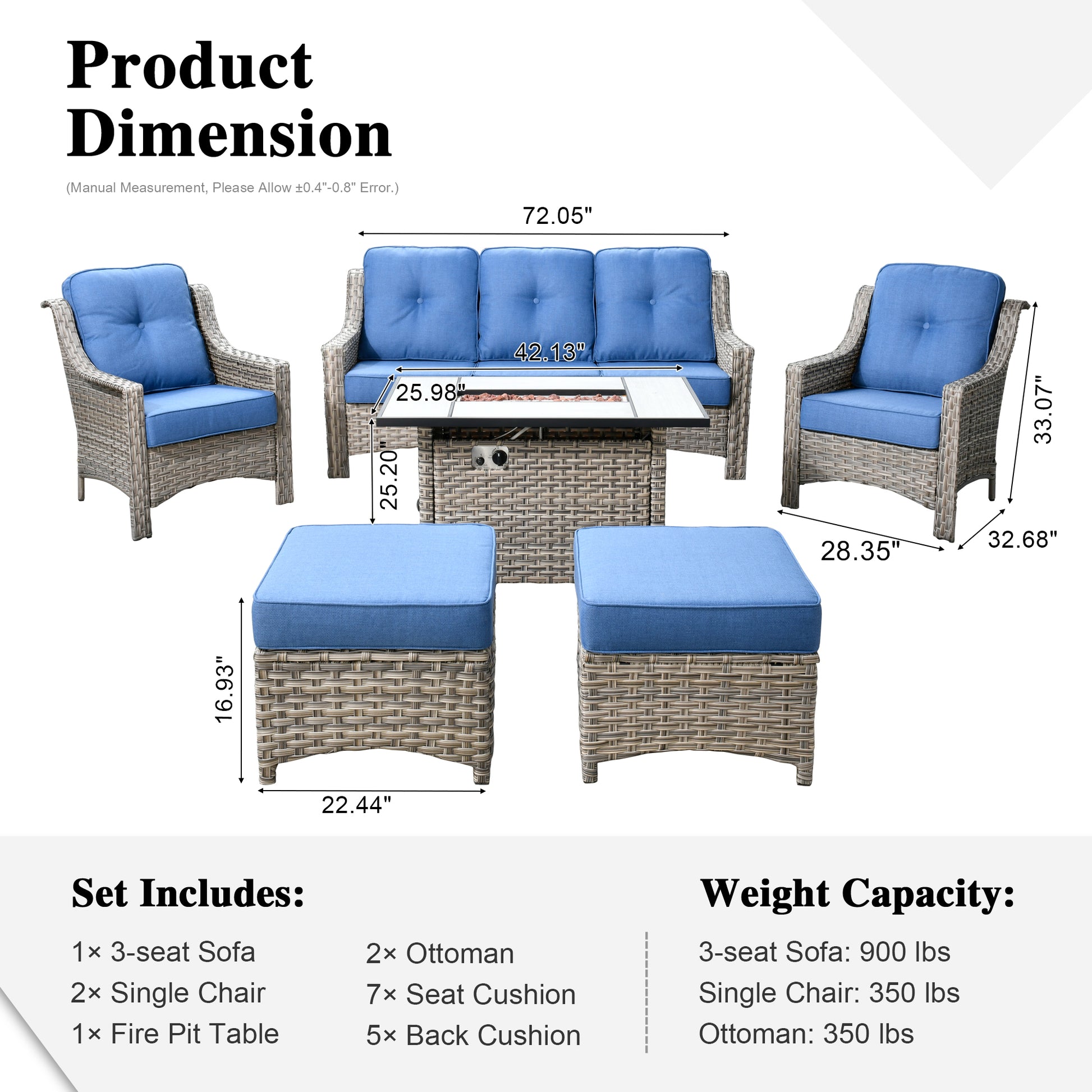 Vcatnet 6 Pieces Conversation Set Outdoor Patio PE Wicker High-Back Furniture with Fire Pit Table ,Diamond Blue