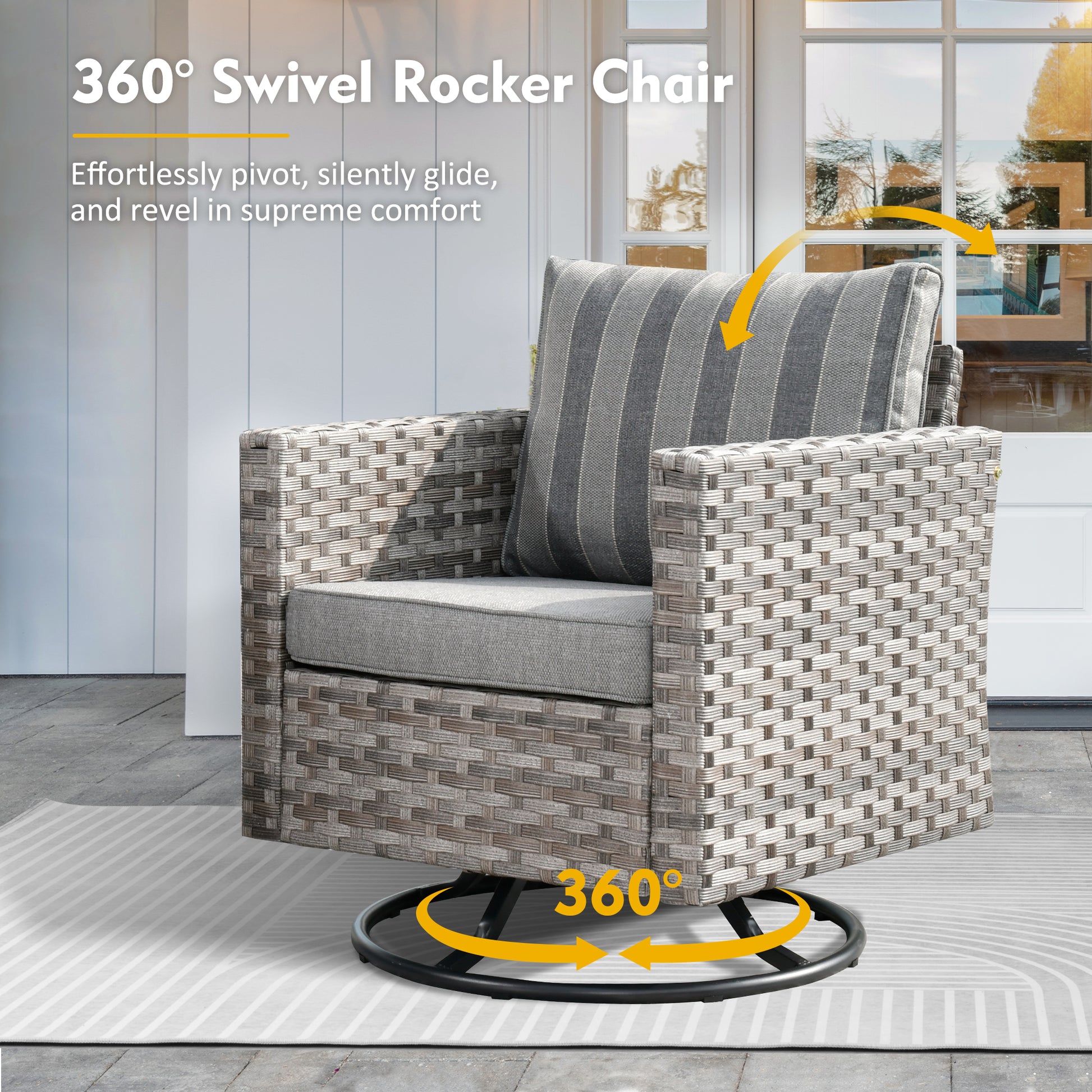 【360°Swivel and Rocking】Our swivel chair is a perfect combination of rocking and swivelling,which can spin 360 degree,so you can enjoy great mobility with this function. In addition,our swivel chairs allow you to find the perfect angle with ease,whether facing or leaving the sunlight